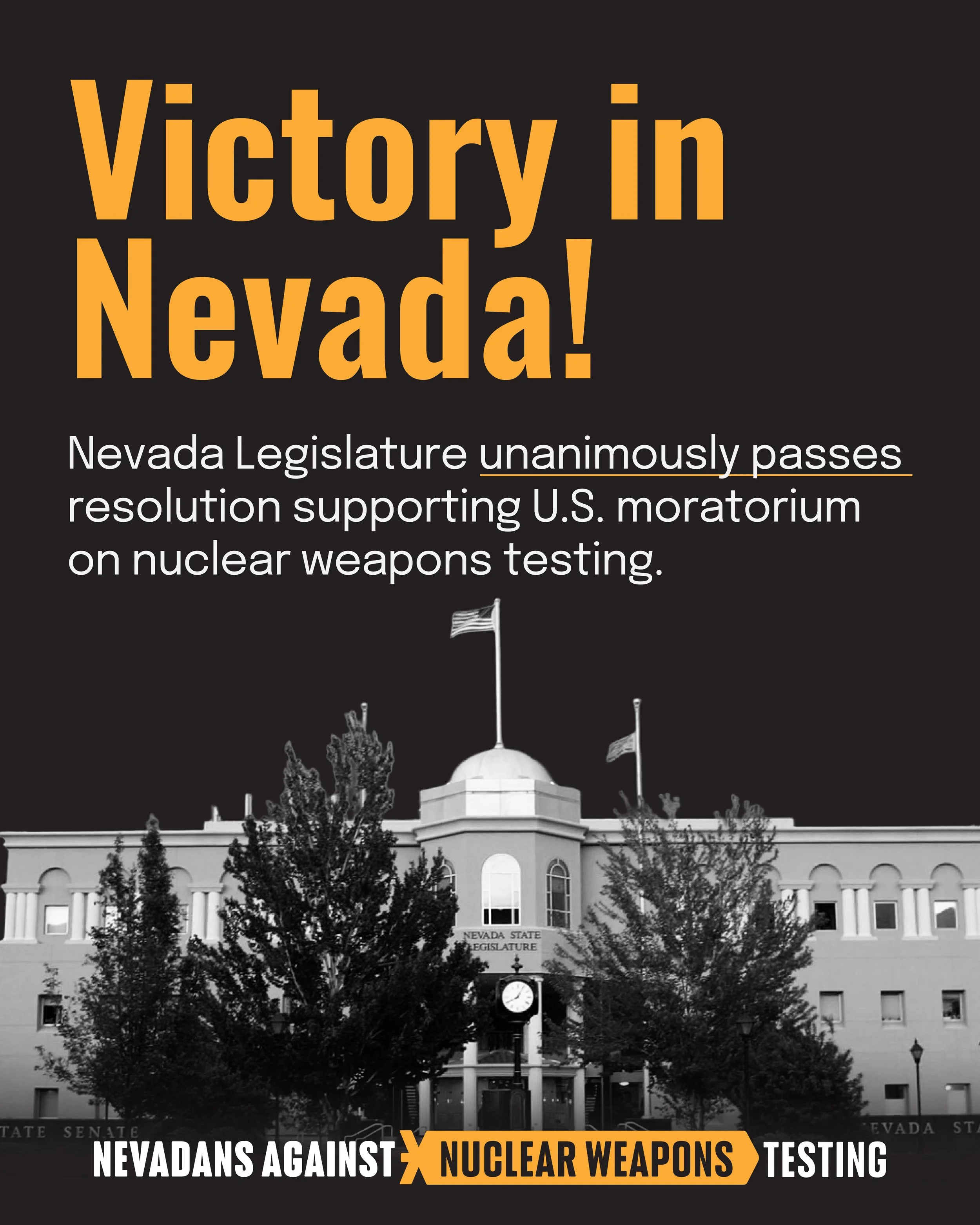 The Nevadans Against Nuclear Weapons Testing coalition worked with legislators and stakeholders across Nevada to maintain the federal government’s three-decades-long moratorium on explosive nuclear weapons testing. In 2025, thanks to the coalition's advocacy efforts, the Nevada state legislature unanimously passed a resolution urging the federal government to maintain the moratorium.